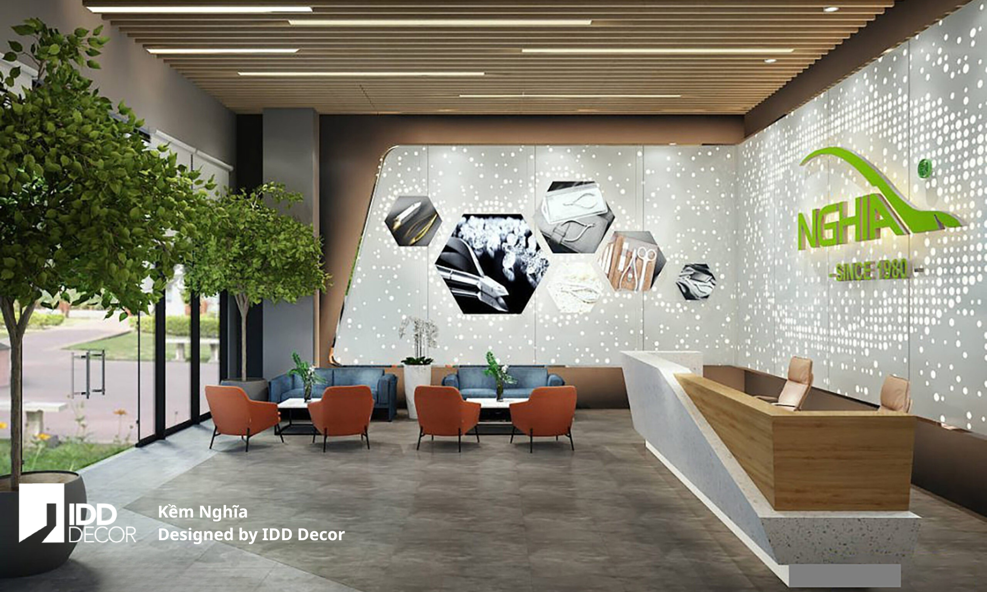 Thiết kế lễ tân Kềm Nghĩa – Doanh nghiệp Việt xuất khẩu toàn cầuVới mục tiêu thể hiện sự uy tín và bề dày phát triển, IDD Decor đã thiết kế hệ thống ánh sáng trung tính tại khu vực lễ tân văn phòng Kềm Nghĩa. Ánh sáng trắng nhẹ giúp làm nổi bật vật liệu đá vân mây kết hợp kính, tạo cảm giác hiện đại và tinh khiết, đồng thời đảm bảo đủ ánh sáng công năng cho nhân viên lễ tân vận hành liên tục. |